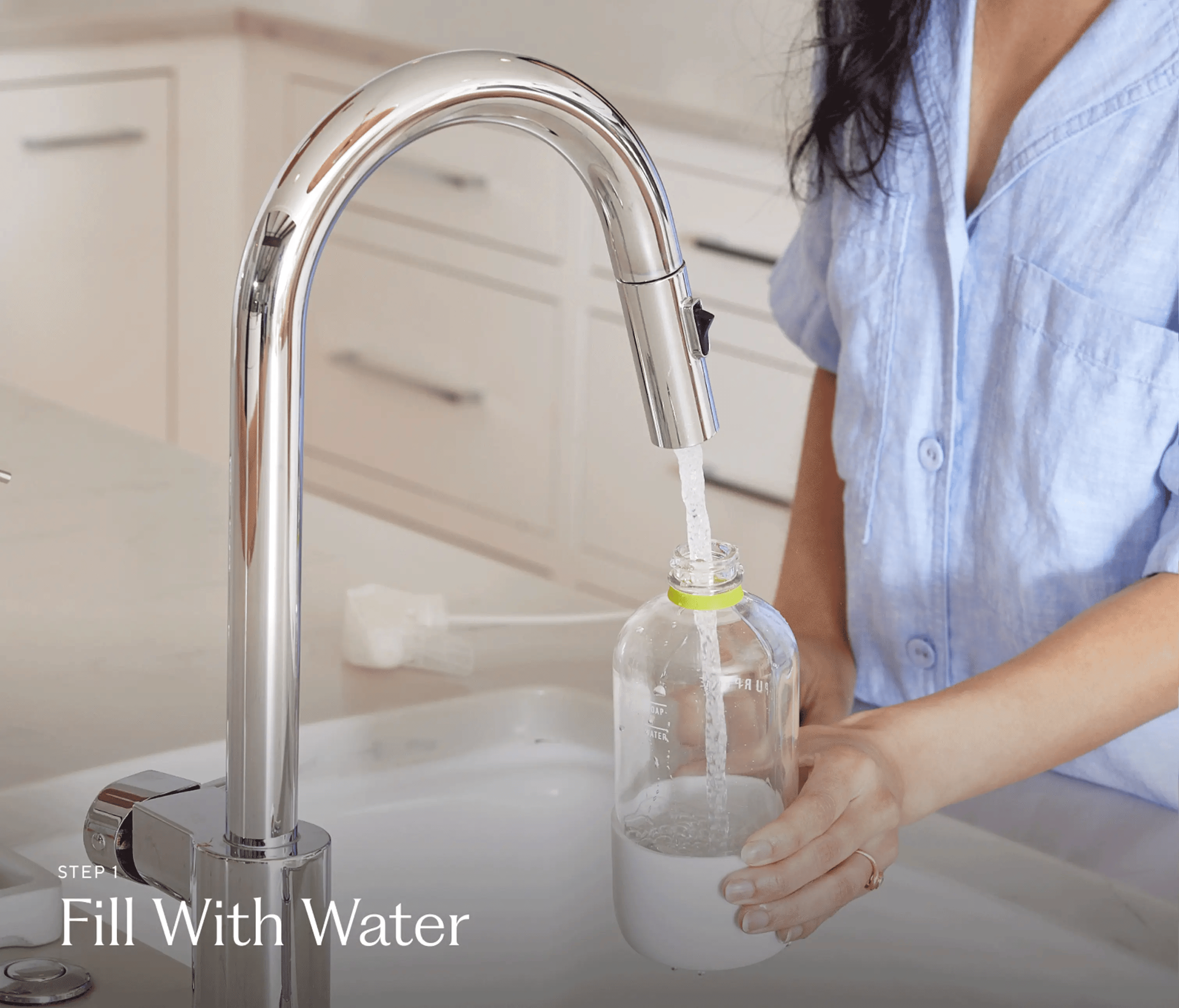 Fill bottle with water to the "water" line on the label.
